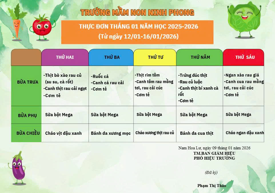 THỰC ĐƠN THÁNG 01 NĂM HỌC 2025-2026 (Từ ngày 12/01-16/01/2026)